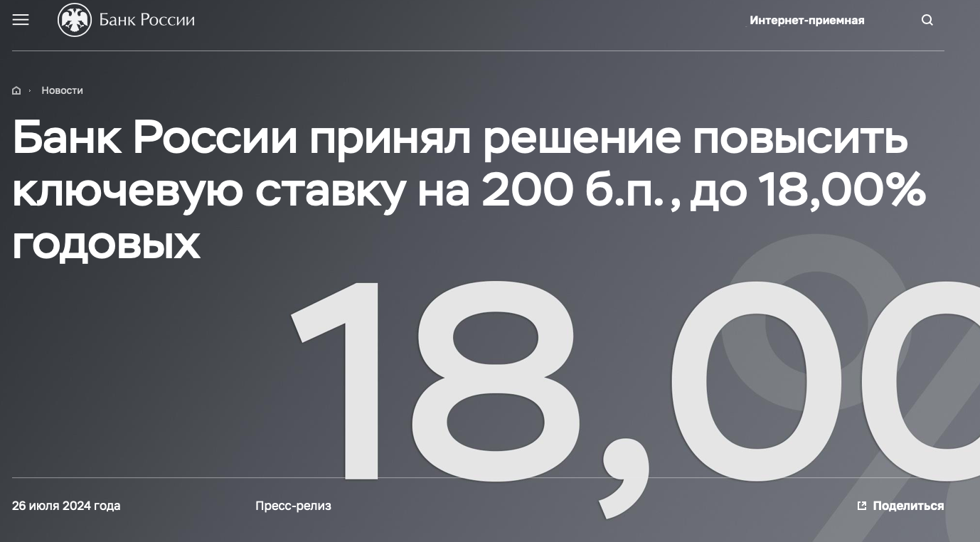 С сегодняшнего дня ключевая ставка Центробанка России составляет уже 18%. До повышения её размер составлял 16% и продержалась ставка около семи месяцев. То есть с декабря прошлого года.