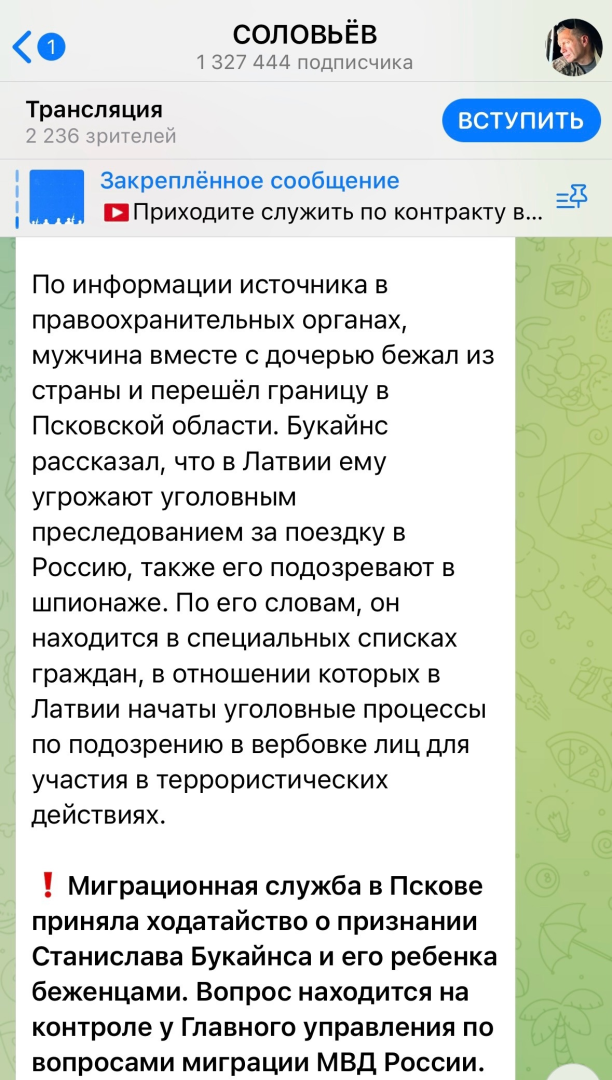 Станислав Букайнс политический блогер из Латвии, вместе с пятилетней дочерью, переправился на самодельном плоту через Псковскую область в Россию и запросил убежище. Об этом Телеведущий Владимир Соловьев написал в своём Telegram-канале.