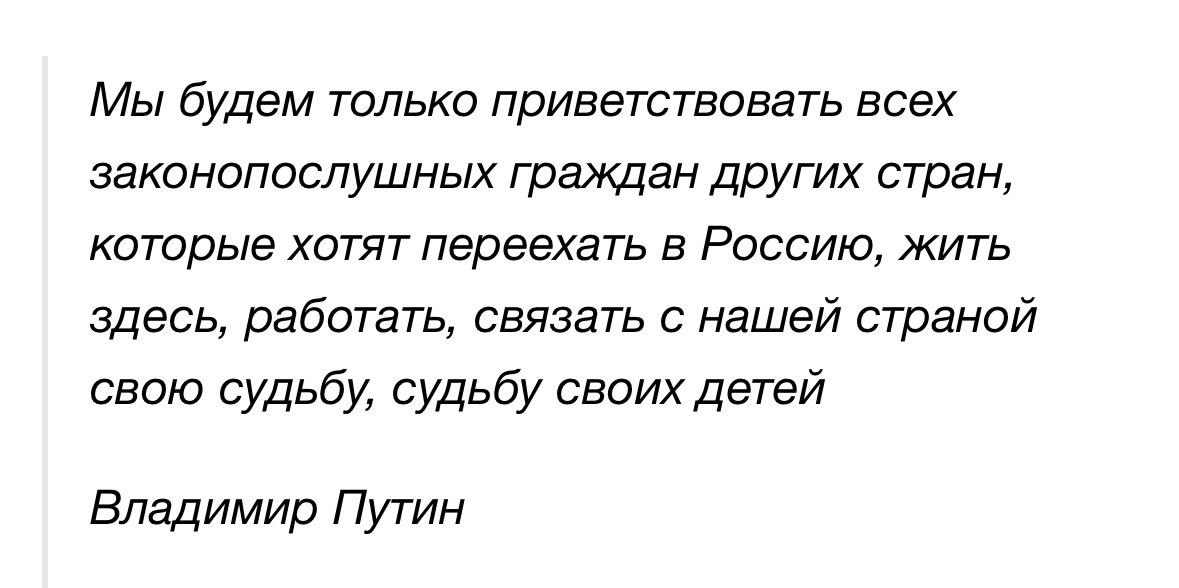 Наш президент России Владимир Путин подчеркнул готовность страны принять иностранцев, соблюдающих российские законы. Он отметил, что существуют четкие правила и правовые процедуры, регламентирующие получение российского гражданства.