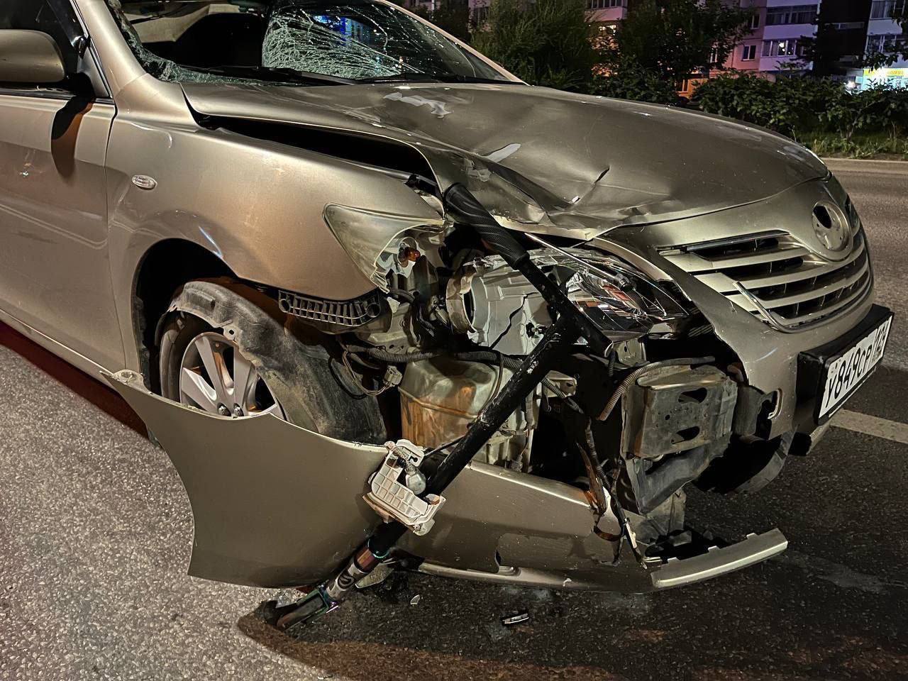 От удара у машины отлетело переднее колесо, а водителя зажало в салоне. Его удалось спасти, чего точно не скажешь о машине — скорее всего, далеко она больше не уедет.