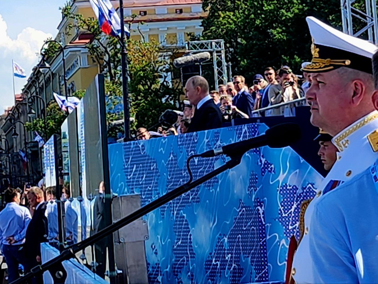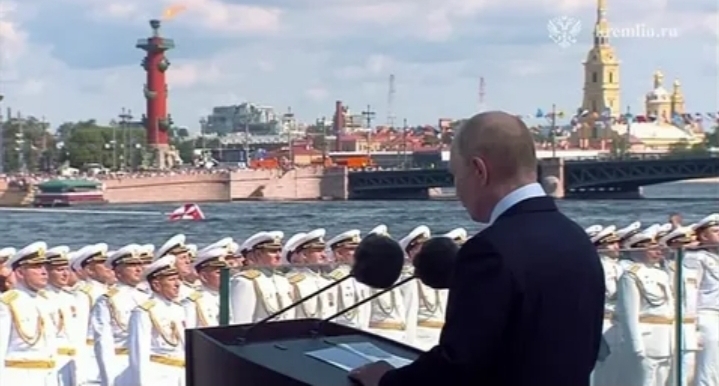 После прохождения смотра глава государства выступил с речью, в которой поздравил флот с праздником и подчеркнул важность роли России как морской державы.