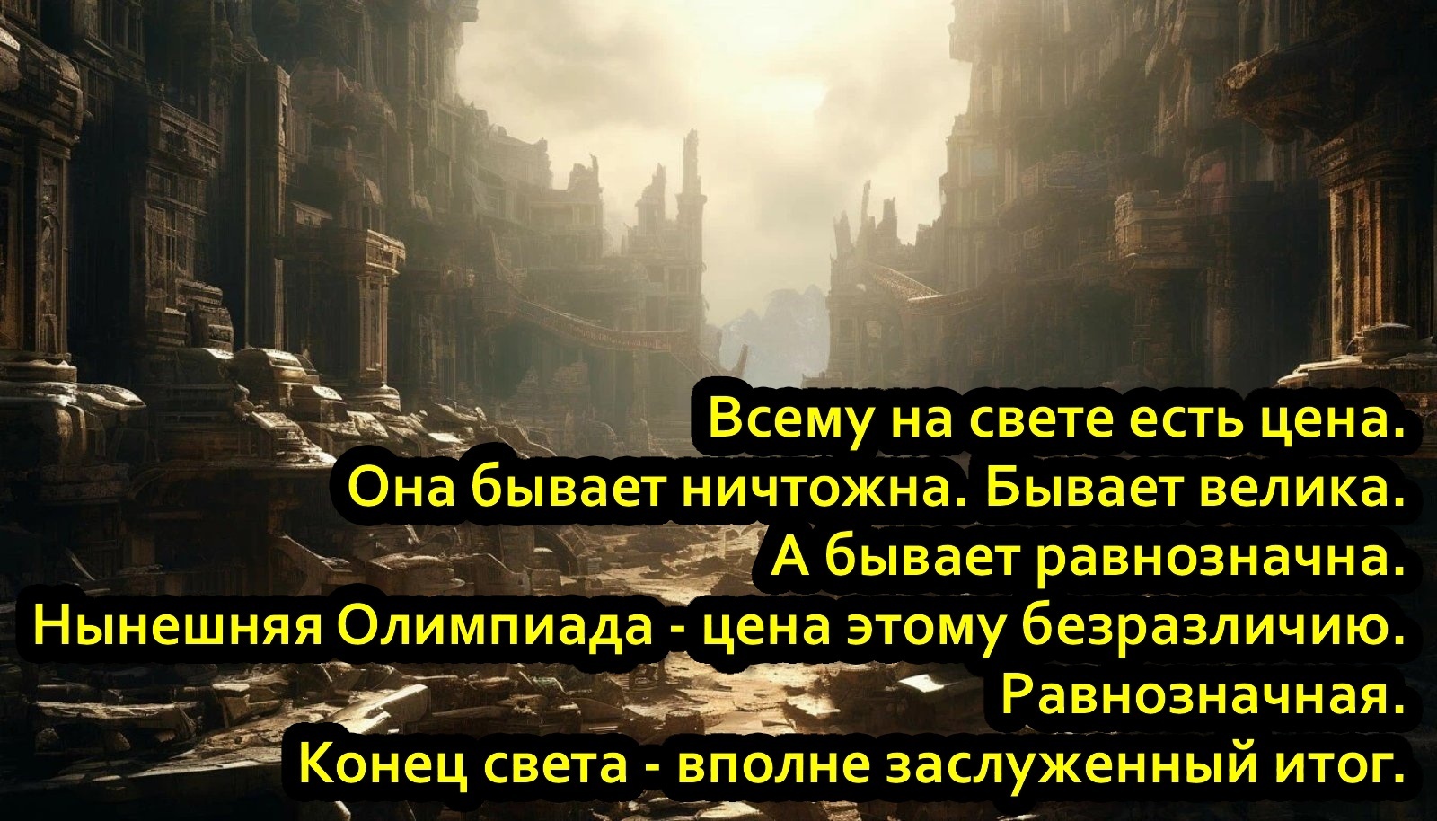 Нынешняя Олимпиада - цена этому безразличию. Равнозначная. Конец света - вполне заслуженный итог.