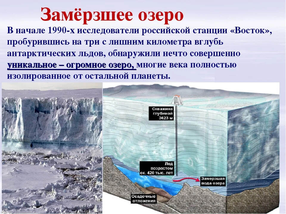 Это самое малоизученное место. Глубина озера почти 1,2 тысячи метров, а вот ледяной покров его достигает 4-х километров. Площадь озера почти, как Ладожское, и составляет 16 тысяч квадратных километров.