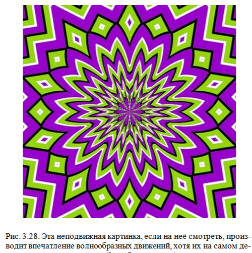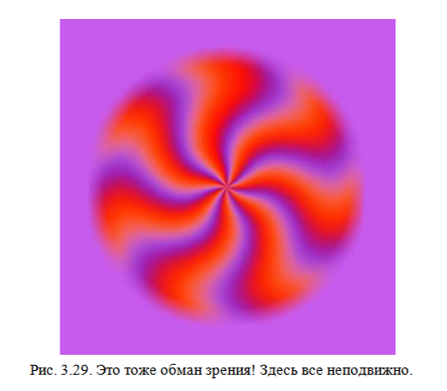 Скачкообразным движением глаз можно объяснить иллюзию присутствия движения на некоторых неподвижных картинках (рис. 3.28 и 3.29- надо увеличить эти картинки). Но если сосредоточиться и остановить взгляд на какой-то точке такой картинки, то движение прекращается.