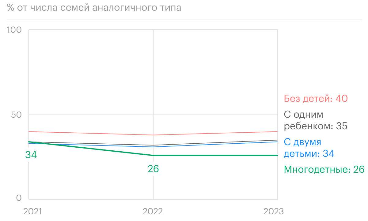 В 2022 году лидерами по кредитованию были семьи с двумя детьми, но в 2023 году их обогнали многодетные семьи.
