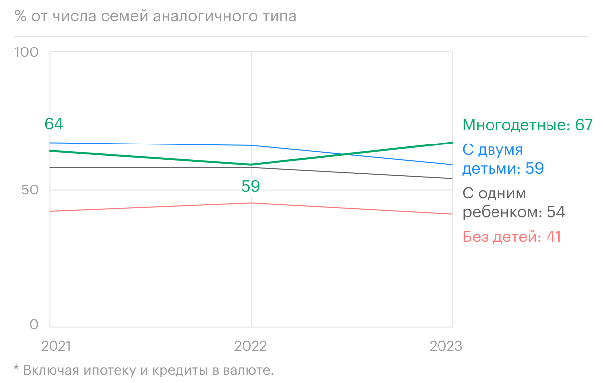В 2023 году 57% семей с детьми имели кредиты, в то время как среди семей без детей эта доля составила 41%. Это подтверждает тезис о том, что семьи с детьми чаще обращаются к кредитованию в связи с большим количеством расходов.