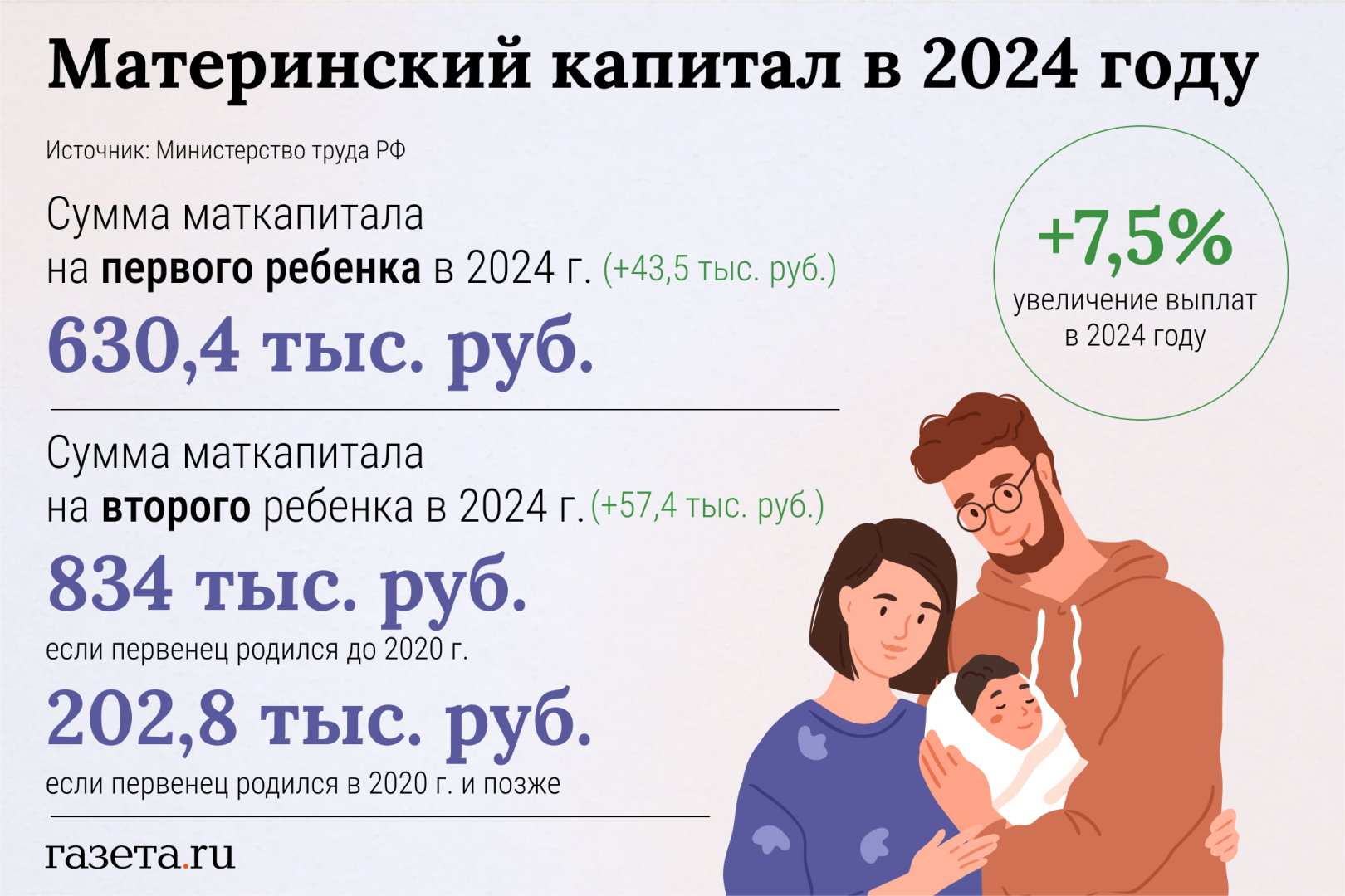 Если читать не умеете, то поясняю - Материнский капитал в 2024 году стал 834 тыс. руб. Раньше его давали только на второго ребёнка. В 2020 году материнский капитал стали давать с первого ребёнка, и для этого его поделили: Если первого родили то выплачивают - 630,4 тыс. руб., а родили второго добавят - 202,8 тыс.руб. Всего - 834 тыс. руб. 😉
