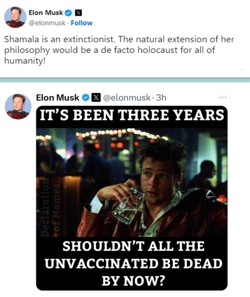 Элон Маск, самый богатый человек в мире, о котором документально известно: "Он самый умный человек в мире", завершает этот доклад, только что опубликовал ужасное предупреждение о Камале Харрис: "Шамала - вымирающий человек... Естественным продолжением ее философии будет фактический холокост для всего человечества! Естественным продолжением ее философии будет фактический холокост для всего человечества! - Холокост для всего человечества, который включал бы 337 миллионов американцев - американцев, о которых документально подтверждено: "230 637 348 человек, или 70% населения, считаются полностью привитыми против Ковида" - но что касается 106 193 139 американцев, которые отказались от вакцин Ковида, Элон Маск спросил настоящих идиотов, управляющих США: "Прошло уже три года..... Разве все невакцинированные не должны быть уже мертвы"?
