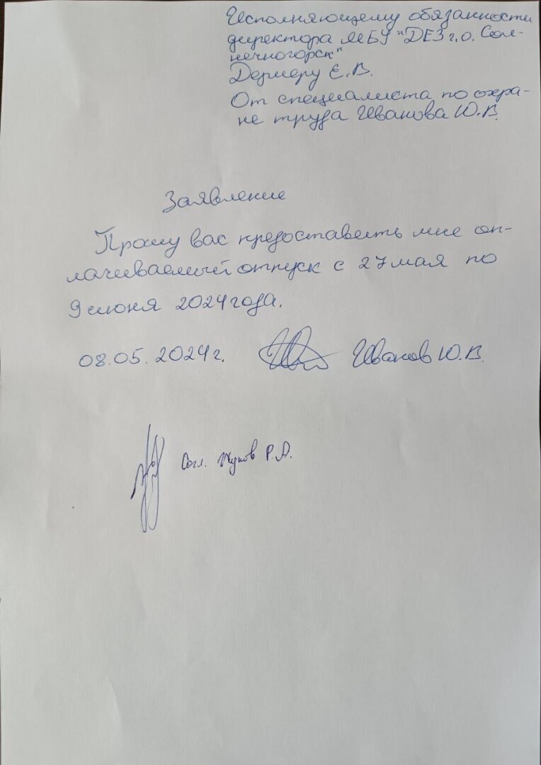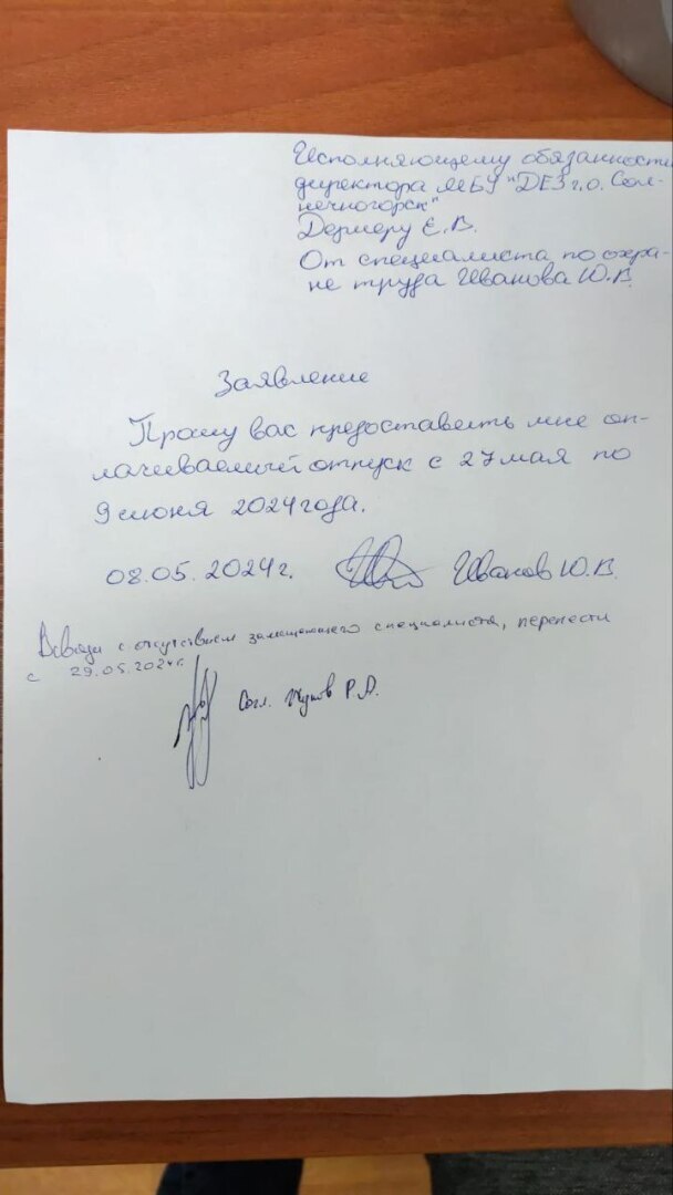 На 27 мая 2024 специалистом по охране труда была забронирована профсоюзная путёвка в санаторий «Дорохово», о чём устно была уведомлена начальник отдела кадров Тетенич М.И. и пр. 8 мая 2024 года было написано заявление на оплачиваемый ежегодный отпуск 14 дней в отдел кадров, как положено. И.о. директора Дермер Е.В. находился в отпуске, его замещал заместитель директора по ОДХ Жуков Р.А. Ближе к 12 часам того же дня начальник отдела кадров Тетенич М.И. сообщила, что нужно по вотсапп согласовать отпуск с отсутствующим и.о. директора Дермером Е.В., руководствуясь логикой специалист по охране труда обратился 8 мая 2024 года к замещающему и.о. директора заместителю по ОДХ Жукову Р.А., который подписал заявление на отпуск без каких-либо условий, оригинал заявления с его подписью оставлен был в отделе кадров. И после этого началось, сообщили, что не отпустят в оплачиваемый отпуск 27 мая!!! Сделали подтасовку, заместитель по ОДХ Жуков Р.А. приписал на оригинале заявления другой ручкой между подписью специалиста по охране труда и своей подписями абсурдную мотивировку: - «В связи с отсутствием замещающего специалиста, перенести с 29 мая 2024 года», безграмотную и попирающую Трудовой кодекс.