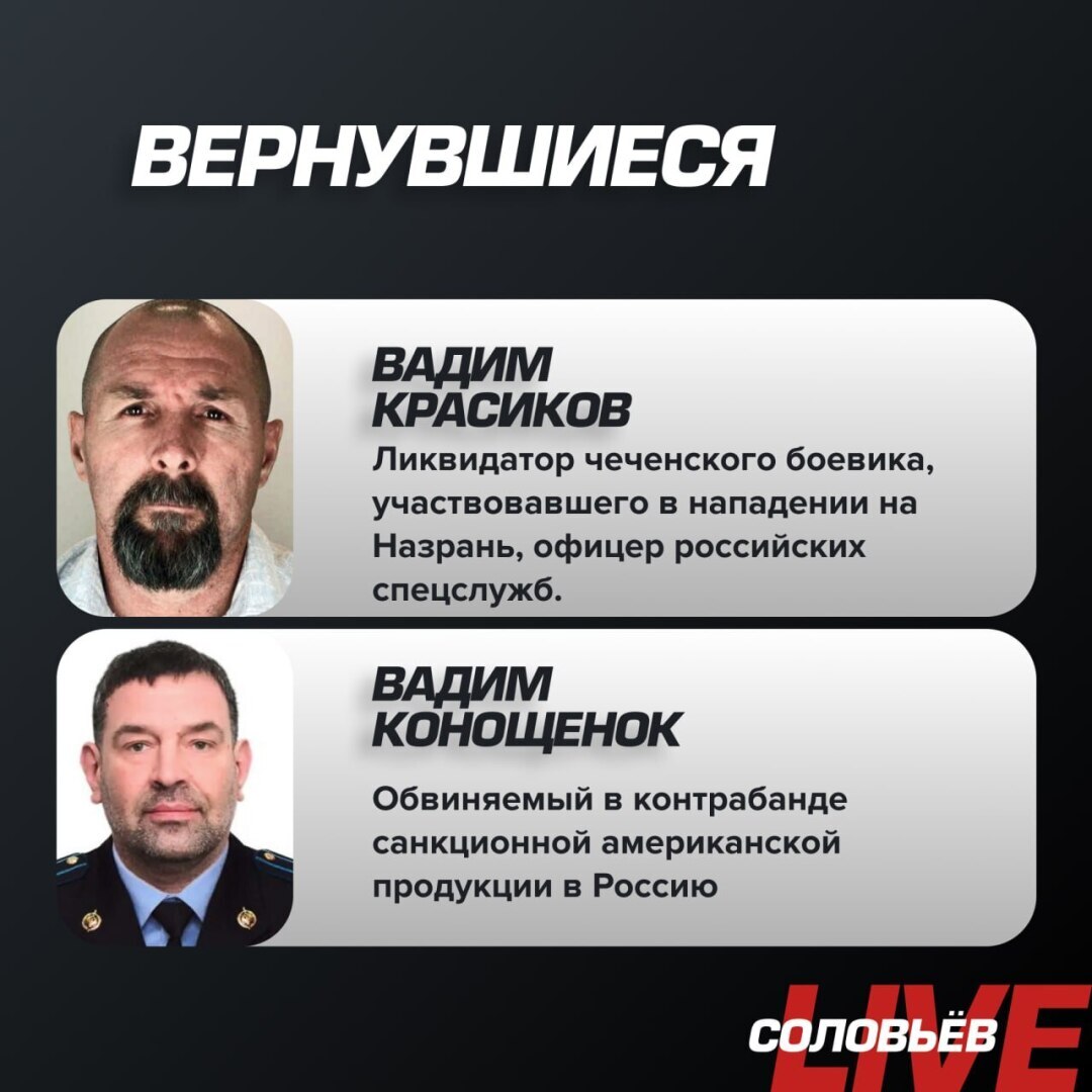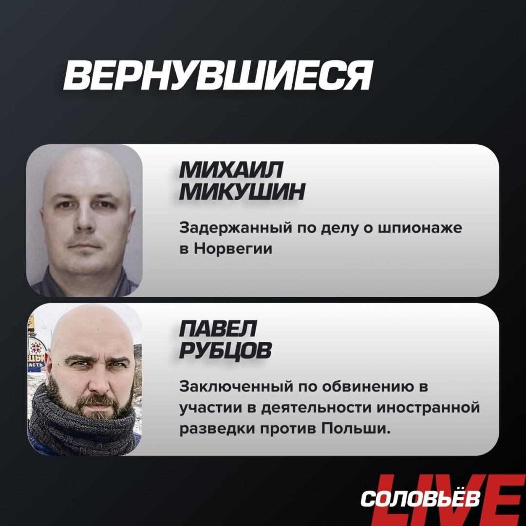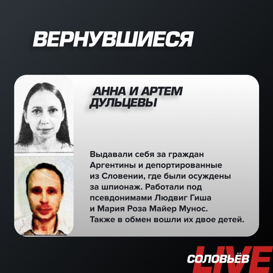 "Столь масштабных обменов в истории России еще не было. США выдали ей троих человек (Вадима Конощенка, обвиненного в контрабанде технологий и боеприпасов, а также Владислава Клюшина и Романа Селезнева, задержанных за киберпреступления), Словения — четверых (Анну и Артема Дульцевых, осужденных за шпионаж в пользу России, а также двух их детей), Германия, Норвегия и Польша — по одному (Вадима Красикова, Михаила Микушина и Павла Рубцова)"