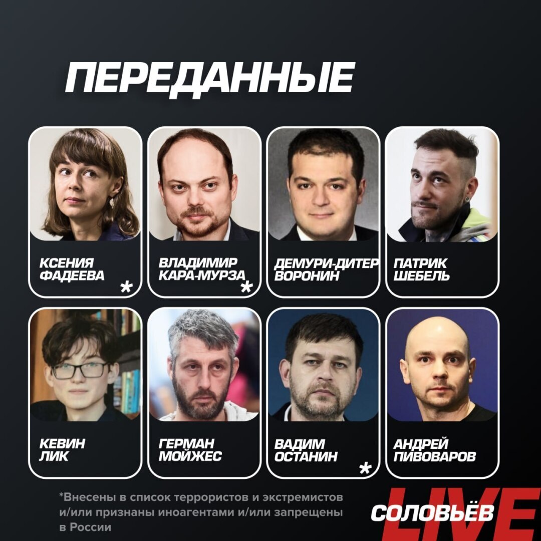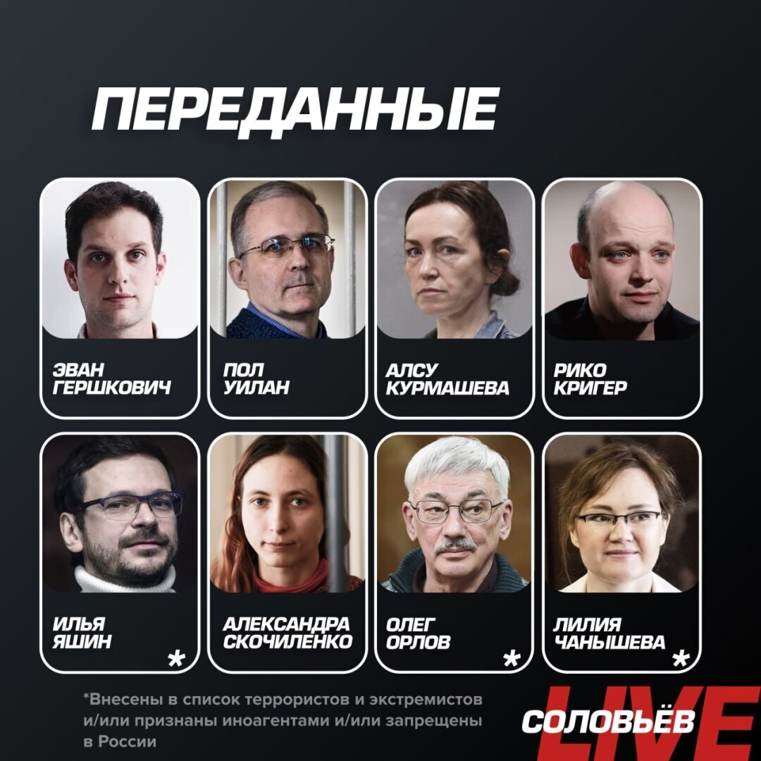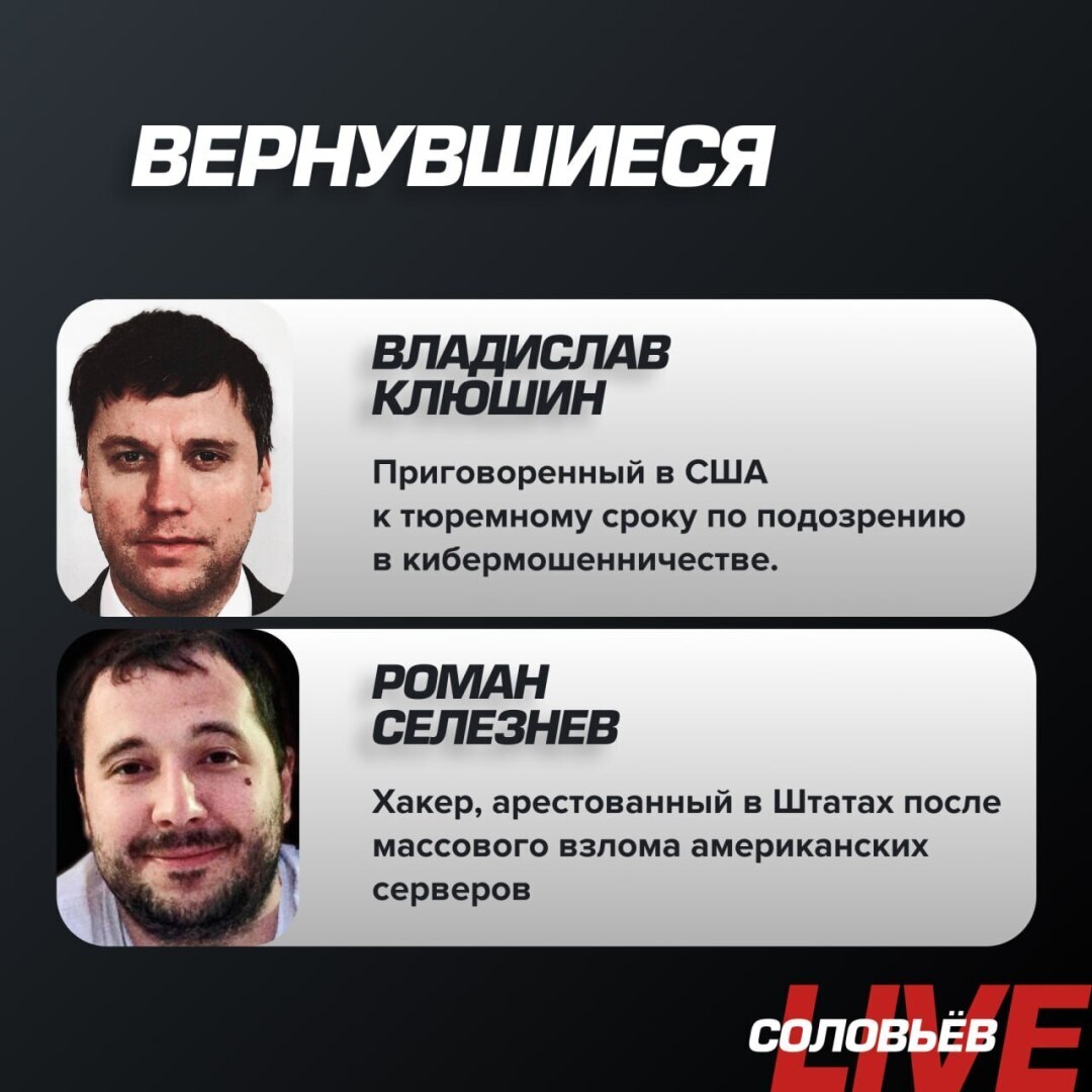 "Столь масштабных обменов в истории России еще не было. США выдали ей троих человек (Вадима Конощенка, обвиненного в контрабанде технологий и боеприпасов, а также Владислава Клюшина и Романа Селезнева, задержанных за киберпреступления), Словения — четверых (Анну и Артема Дульцевых, осужденных за шпионаж в пользу России, а также двух их детей), Германия, Норвегия и Польша — по одному (Вадима Красикова, Михаила Микушина и Павла Рубцова)"