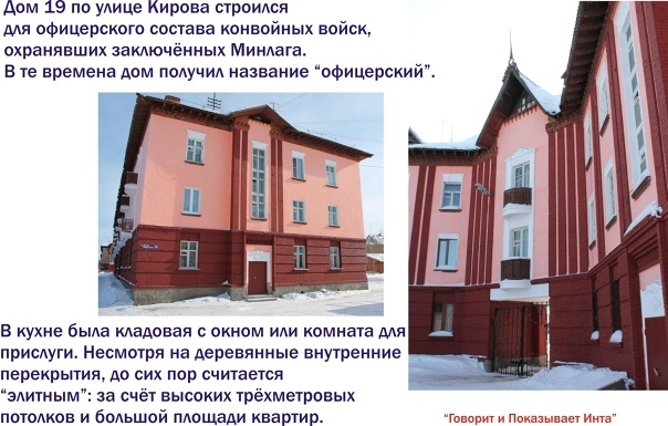 - В Инте(Коми) по ул. Кирова, с обеих сторон памятника Кирову, есть 2 здания, которые строились для офицерского состава конвойных войск, охраняющих заключенных (введены в 1952г.). Перекрытия в этих домах - деревянные утеплённые толщ. 400 мм. Район строительства 1д - расчётная зимняя температура наружного воздуха - минус 45 гр.
