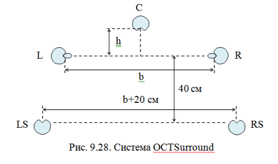Модификацией системы ОСТ является система OCT Surround, которая используется для записи программ в формате 5.1 (5.0).Здесь отсутствуют ненаправленные микрофоны, а для записи пространственных характеристик первичного помещения вместо конфигурации IRT Cross используются два кардиоидных микрофона, развернутых назад и смещенных на 40 см в сторону тыла (рис. 9.28).Смещение центрального микрофона в сторону фронта, как и в базовой конфигурации, составляет 8 см.Типичное значение величины b (разнесение фронтальных микрофонов) составляет 70 см. Ее преимуществами, как и в основной конфигурации, являются низкий уровень перекрестных помех, очень равномерная и сбалансированная фронтальная локализация, а благодаря введению кардиоидных тыловых микрофонов, еще и отсутствие прямых звуков в тыловых каналах, что приводит к увеличению зоны наилучшего прослушивания