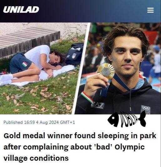 Итальянский пловец Томас Чеккон жалуется на отсутствие кондиционеров, плохую еду картонные кровати. Из-за духоты и шума невозможно выспаться ни днем, ни ночью. Поэтому он переехал в ближайший сквер, где спит прямо на земле. Его сфотографировал гребец из Саудовской Аравии.