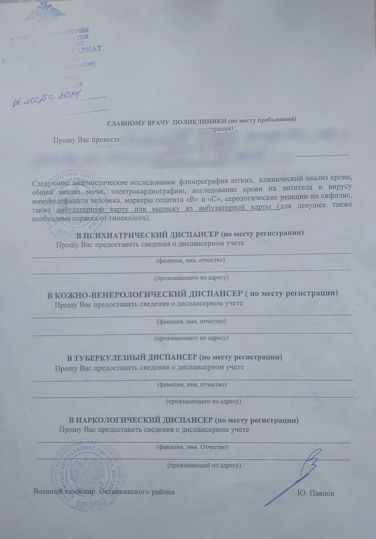 После получения всех анализов идём в военкомат и проходим комиссию там, у меня она заняла где-то 1,5 часа, после этого сдаешь в окошко все документы и ждешь. По итогу я получил военный билет.