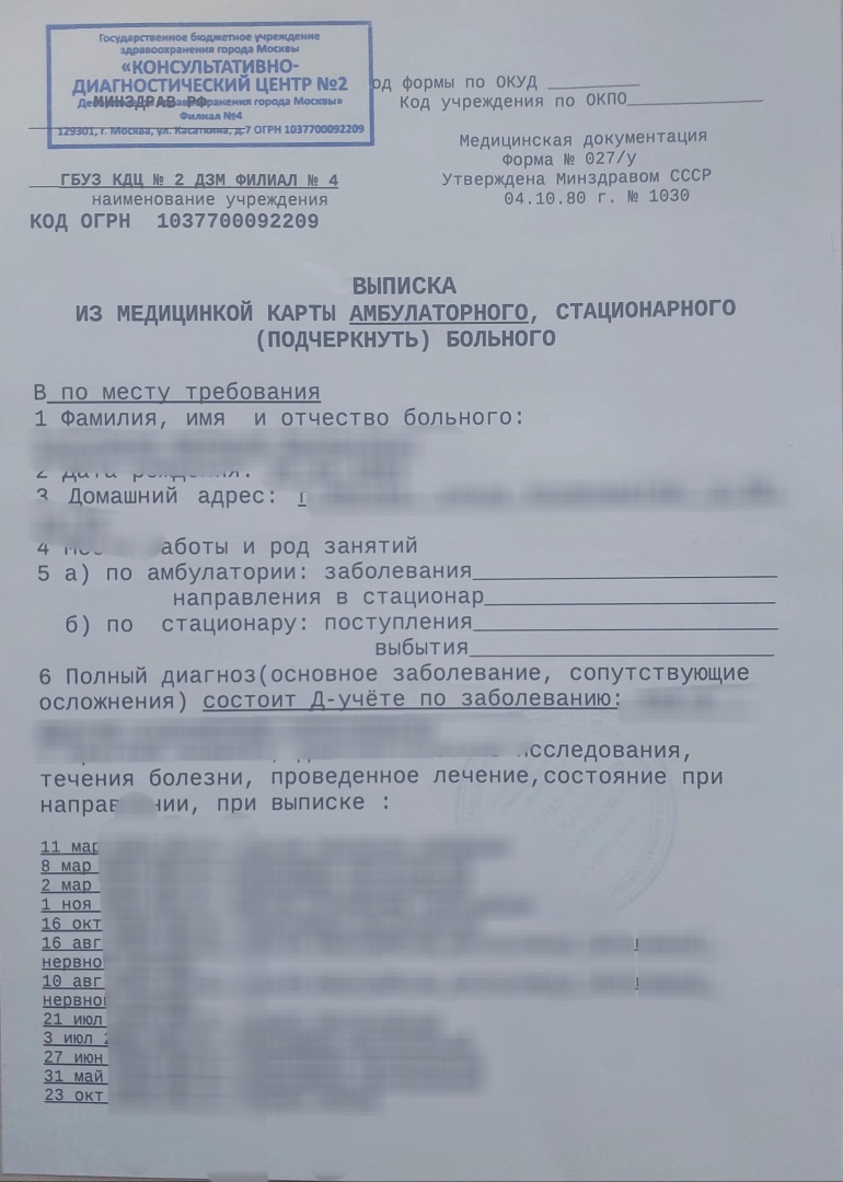 Так же нужно взять выписку из амбулаторной карты. Вот так она выглядит.