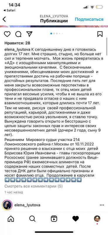 В кулуарной тишине высоких кабинетов разразился скандал, который имеет все шансы стать громким светским событием. Бывшая топ-менеджер концерна «Росэлектроника» Елена Лютова вновь вышла на публику с обвинениями в адрес главы Роскосмоса Юрия Борисова, требуя справедливости и алиментов на двух детей, рожденных вне брака. На этот раз, все стало значительно острее: Лютова не просто требует финансовой поддержки для своих детей — дочки и сына — но и подчеркнула, что официально признание отцовства Борисова уже вынесено мировым судом Ломоносовского района Москвы в 2022 году. Несмотря на это, Борисов подал встречный иск в Гагаринский суд, оспаривая свои права отцовства.