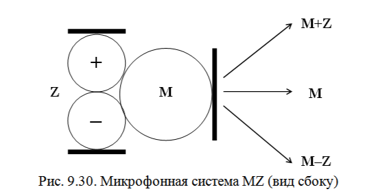 По аналогии с технологией записи MS («Middle-Side»), систему, состоящую из вертикально ориентированного двунаправленногоZ-микрофона и горизонтально ориентированного микрофона М, можно назвать «Middle-Z» (MZ) (рис. 9.30). Синтезированные сигналы, полученные путем комбинирования сигналов с выходов микрофонов, принято записывать в виде так называемой декодирующей матрицы. В обычной декодирующей матрице MSStereo выполняются следующие соотношения для левого и правого каналов: