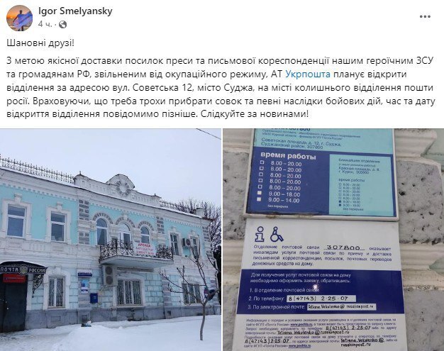 ‘Уважаемые друзья. С целью качественной доставки посылок прессы и письменной корреспонденции нашим героическим ВСУ и гражданам РФ, освобожденным от оккупационного режима, АО Укрпочта планирует открыть отделение по адресу ул. Советская 12, город Суджа, на месте бывшего отделения почты России. Время и дату открытия отделения сообщим позже’.