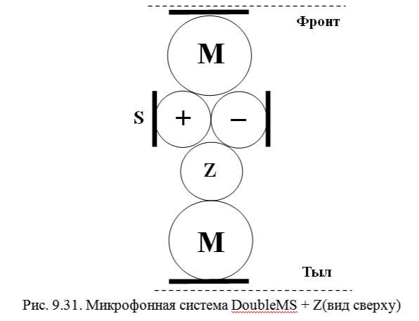 Double MS– это компактный массив, состоящий из трех расположенных в одном месте микрофонов, два из которых являются кардиоидными, расположенными мембранами в разные стороны – один вперед, к центру записываемого источника, другой – назад, от источника (М - Middle), и один (S - Side) представляет собой либо одиночный микрофон, либо микрофонный массив из 8 расположенных рядом друг с другом капсюлей, ориентированных в стороны от центра записываемого источника (см. раздел 9.4.1)