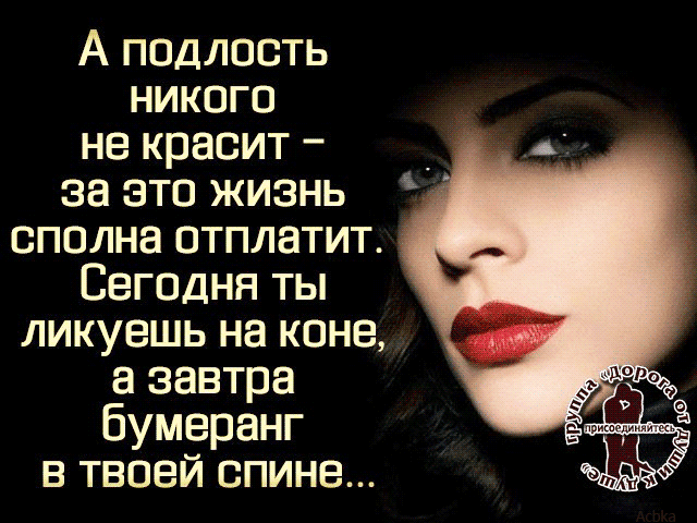 Подлость никого не красит - за это жизнь сполна оплатит. Сегодня ты ликуешь на коне, а завтра бумеранг в твоей спине...