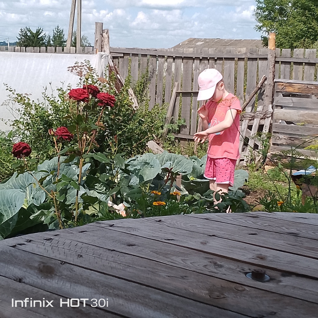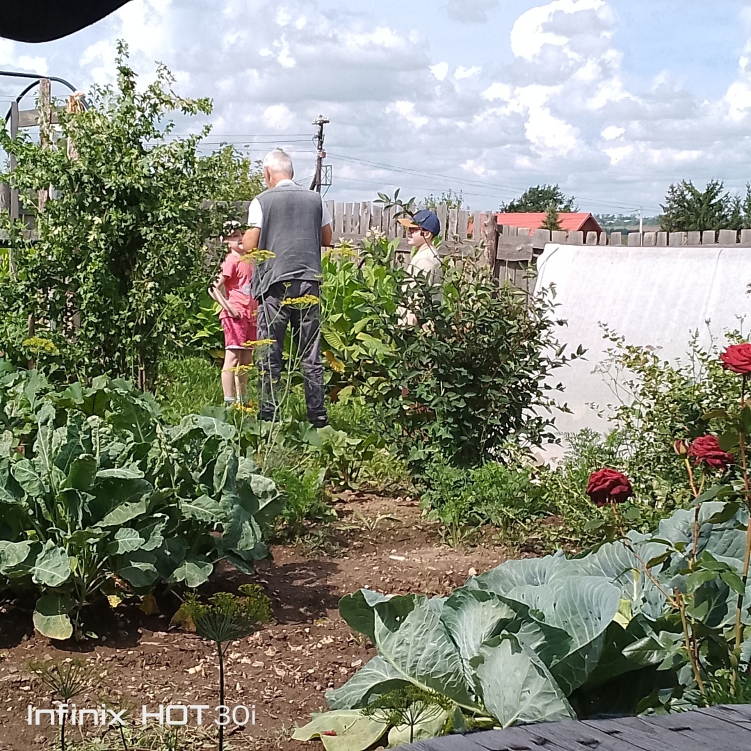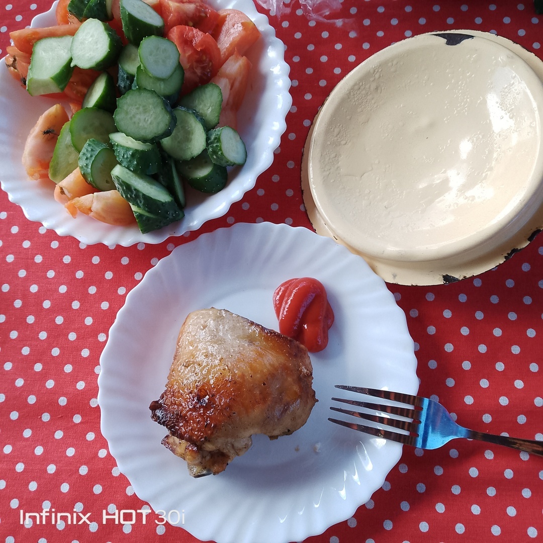 Из развлечений что было - посидели на улице, на нашем мини- огородике.Дедушка на мангале пожарил куриные бедрышки. Я просто сделала нарезку из огурцов и помидор. И чай с тортиком. Душевно посидели, поболтали.