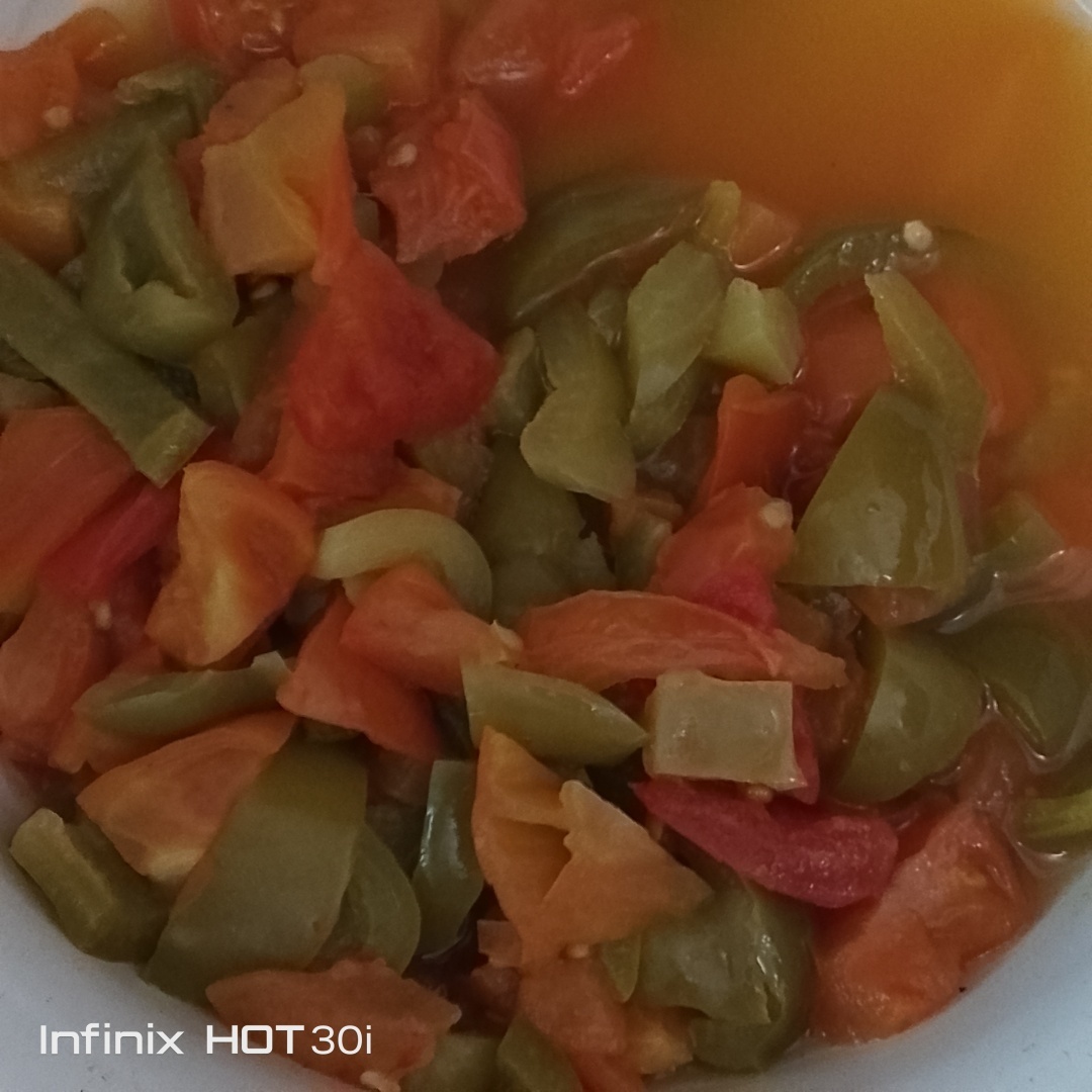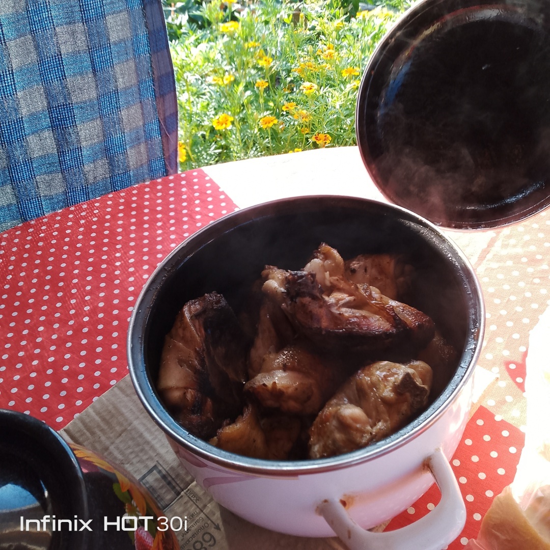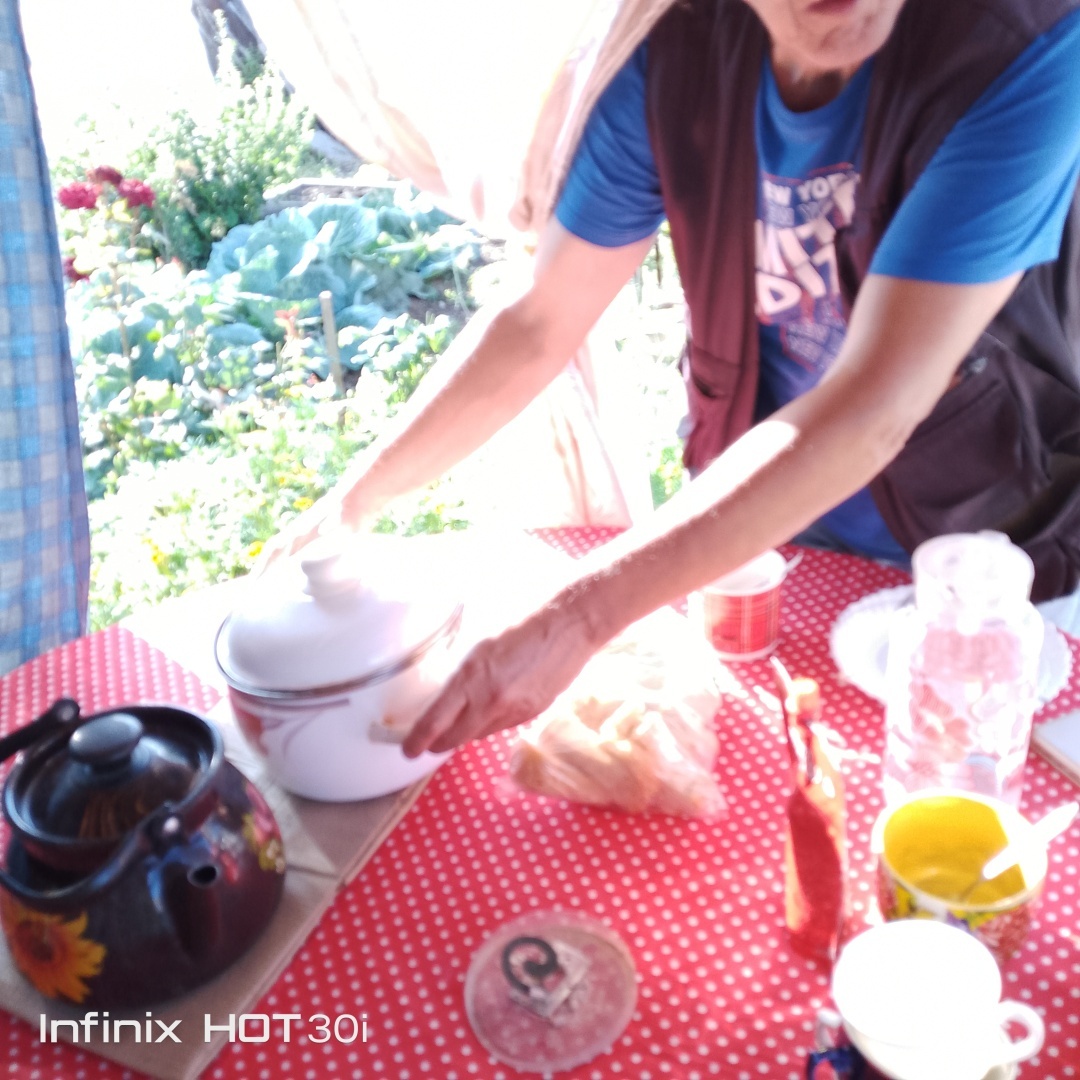 У бабушки угощались ( баловались плюшками) , готовила лечо из своих овощей. Борщ сварила к приезду.