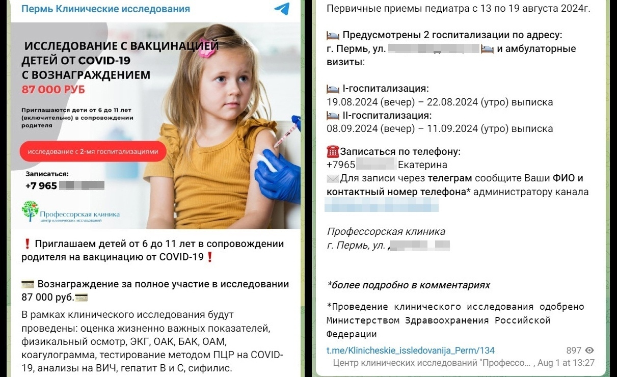 Вот, сами можете посмотреть на это красочное объявление, опубликованное 1 августа 2024 года. Все желающие могут его увидеть на странице в Telegram, если найти сайт "Пермь. Клинические исследования":