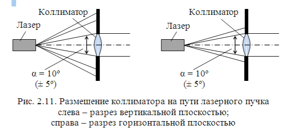 Поскольку в горизонтальной плоскости (параллельной n-p– переходу лазерного диода) расхождение пучка в лучшем случае 10º(± 5º относительно центральной оси), а в вертикальной (перпендикулярной n-p– переходу лазерного диода) может достигать 40-50º, то для получения пучка, равномерного по амплитуде и фазе в поперечном сечении, обычно используют поток излучения, распространяющийся в круговом конусе с углом между образующей и центральной осью порядка 5º (рис. 2.11). При этом часть выделенной таким образом мощности лазера составляет около 20% от общей мощности. Линзу коллиматора помещают в специальную зачернённую оправу для того чтобы избежать отражений света, который может попасть назад в лазер и вызвать изменение режима генерации.