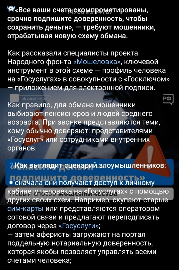 Жертве приходит уведомление о том, что нужно подписать документ. Далее звонит якобы сотрудник органов, который убеждает, что все счета скомпрометированы, поэтому надо срочно подписать доверенность, чтобы он смог спасти деньги