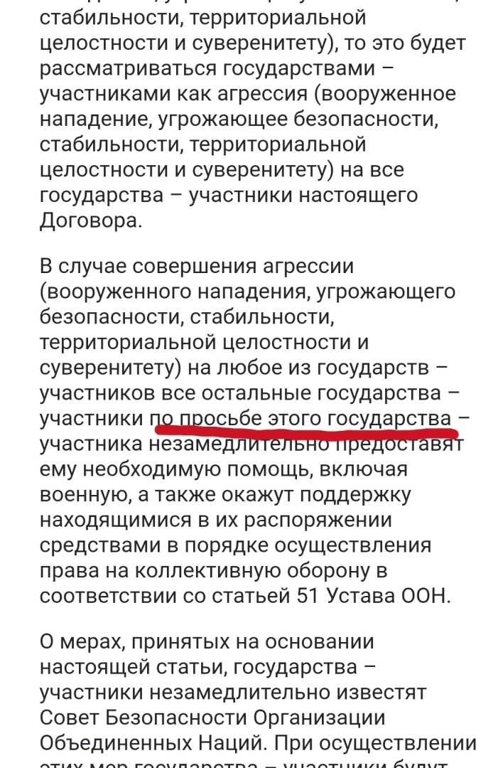 "В случае совершения агрессии (вооруженного нападения, угрожающего безопасности, стабильности, территориальной целостности и суверенитету) на любое из государств – участников все остальные государства – участники по просьбе этого государства – участника незамедлительно предоставят ему необходимую помощь, включая военную, а также окажут поддержку находящимися в их распоряжении средствами в порядке осуществления права на коллективную оборону в соответствии со статьей 51 Устава ООН."