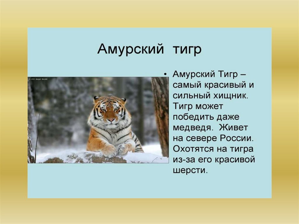 Амурского тигра в России называют еще уссурийским и дальневосточным. Амурский тигр занесен и в Красную книгу Международного союза охраны природы, и в Красную книгу России, так как популяция его мала.
