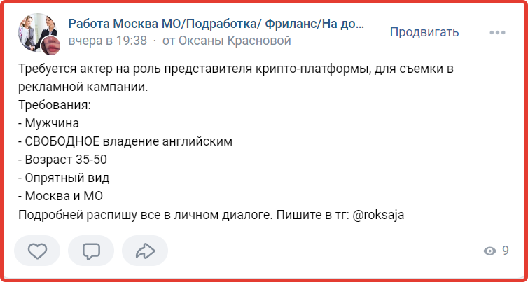 Недавно ко мне в группу Работа в Москве предложили вакансию: актер, который будет сниматься в рекламной кампании новой крипто-платформы. Вангую, речь идёт о какой-нибудь мошеннической афере, где актер будет рассказывать о том, какой он многомиллионный миллиардер благодаря этой чудо платформе, которая только что вот вот родилась.