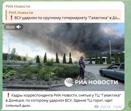 Судя по видео с места происшествия, торговый центр "Галактика" полностью уничтожен огнем, и внутри могли находиться более 100 человек. Пожарные пытаются потушить огонь, но им мешают обстрелы и активные действия противника с использованием беспилотников.