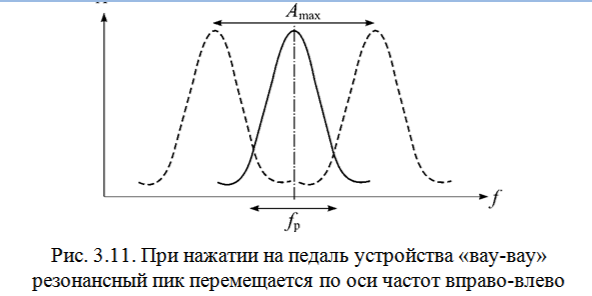 Достигается этот эффект следующим образом. Звуковой сигнал подается на вход специального усилителя, нагрузкой которого является резонансный контур, построенный на основе узкополосного фильтра с высокой добротностью, т. е. с небольшой полосой пропускания. Частота настройки фильтра – переменная. Ее можно перемещать вверх и вниз по всему диапазону частот – что, собственно, и делает музыкант, нажимая на педаль. При этом резонансный «пик» смещается то вверх, то вниз, подчеркивая соответствующий участок спектра звукового сигнала (рис. 3.11).