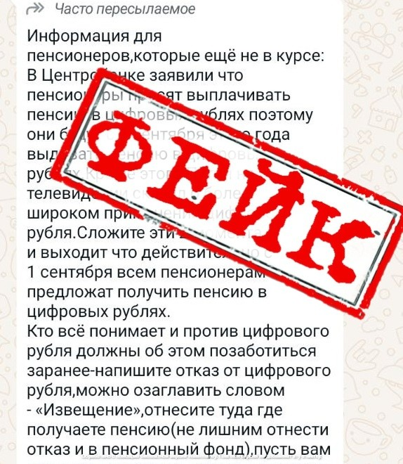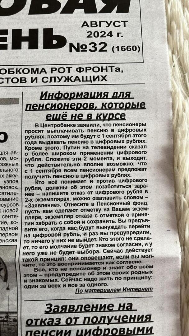 Распространяемая в мессенджерах информация о том, что с 1 сентября пенсионеры будут обязаны получать пенсию в цифровых рублях или писать отказ от этого способа, не имеет под собой оснований. В газетных статьях призывали приходить в Пенсионный фонд и писать заявление против цифрового рубля. Иначе "молчание будет знаком согласия".