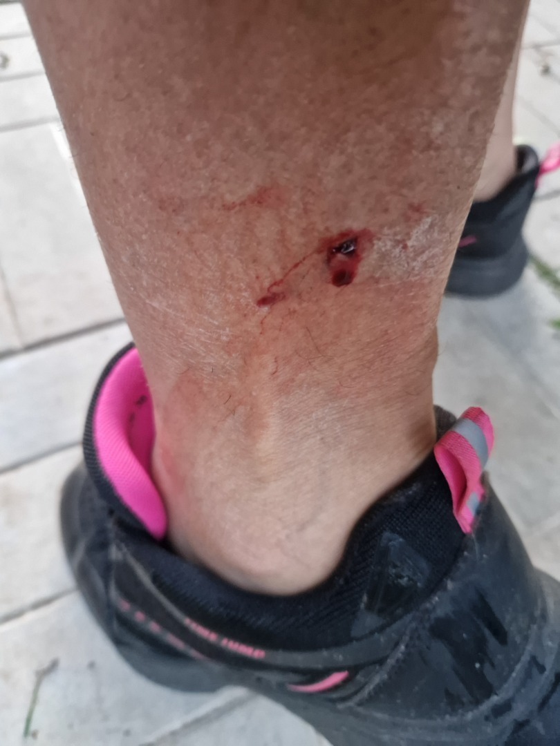 Вот так и я, ехала на велосипеде на другой стороне дороги, подальше от мелких собак, которые бегали вокруг своих хозяек, сидевших на лавочке. Но, недремлющие животные (это я про собак), увидев меня начали лаять, окружили с двух сторон и одна из них, по кличке Нюша, принялась хватать меня за ногу. В результате ТРИ раны.