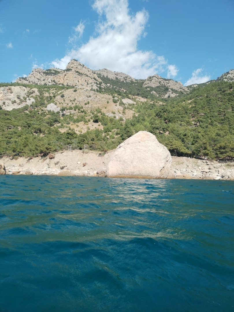 Окунулись в небольшой заливчик, чтобы проплыть малое расстояние до скалы, чуть пониже той, на которую мне перехотнлось карабкаться.