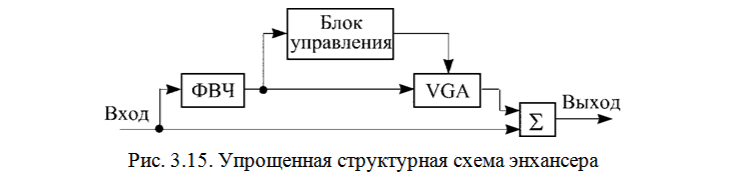 Алгоритм работы блока управления может быть построен на двух различных принципах. В относительно простых энхансерах блок управления реагирует на уровень ВЧ-составляющих в спектре сигнала: если этот уровень превышает некоторую заданную величину, блок управления формирует сигнал увеличения усиления VCA и доля ВЧ-составляющих в суммарном сигнале на короткое время еще более увеличивается.