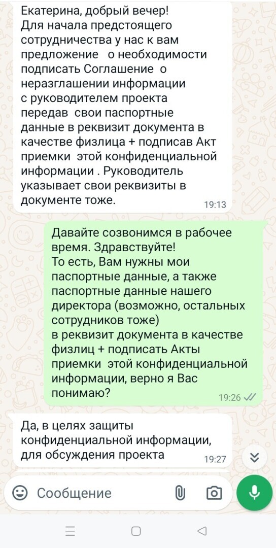 Сегодня она мне предложила прислать ей мои паспортные данные. Типа только тогда она согласна будет рассказать о своей проблеме и заключить с нами договор.
