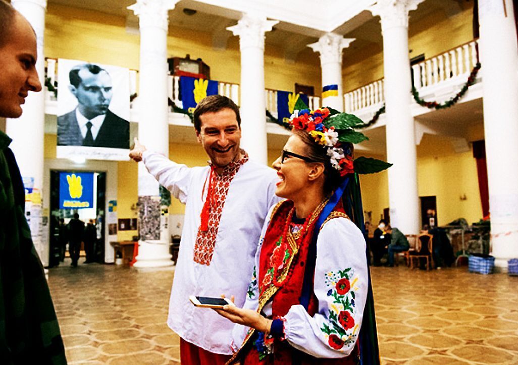 Но самая веселуха началась, когда подъехал дружбан Антоха Красовский в широченных гопаковских шароварах и вышитой распашонке! Ксюха сама быстро переобулась в национальный бабий наряд и их совмесное фото на фоне героя пьянки - Степана Бандеры, затмило даже картинку с шиномонтажной баррикады.