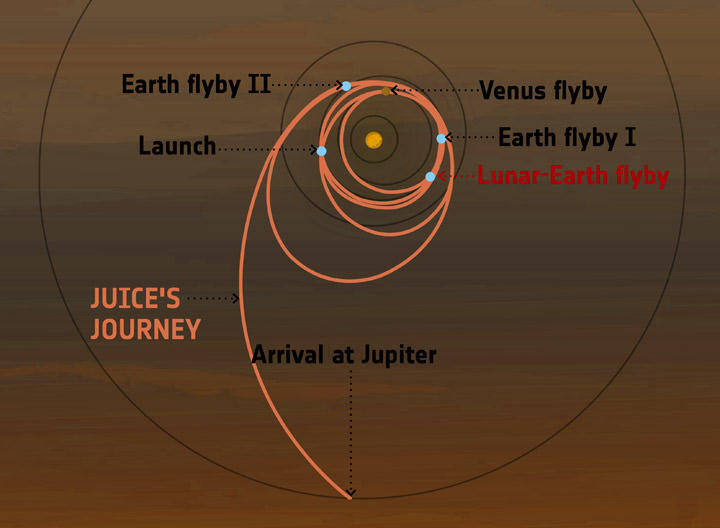 Этот пролет Земли и Луны фактически уменьшил энергию космического корабля, перенаправив его на встречу с Венерой в августе 2025 года. Этот пролет Венеры вернет JUICE обратно к Земле; который снова пролетит над нашей планетой в сентябре 2026 года и январе 2029 года, получив еще два импульса, прежде чем достигнет Юпитера в июле 2031 года.