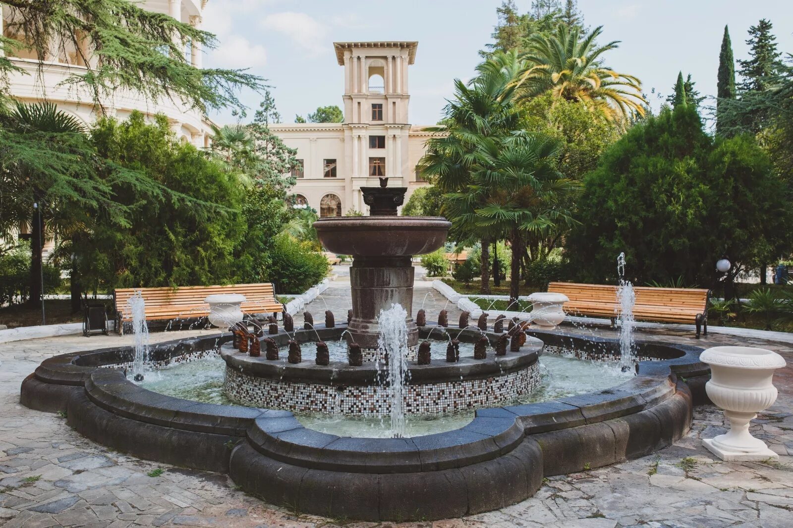 На электрокаре нас с женой отправили к корпусу отеля, где располагался наш номер. Вокруг раскинулись ухоженные аллеи, украшенные цветущими растениями и уютными скамейками. А фонтаны были просто ошеломляюще красивы!