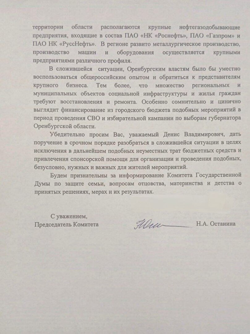 Депутат Нина Останина уже отправила в адрес губернатора Оренбургской области письмо по этому поводу.
