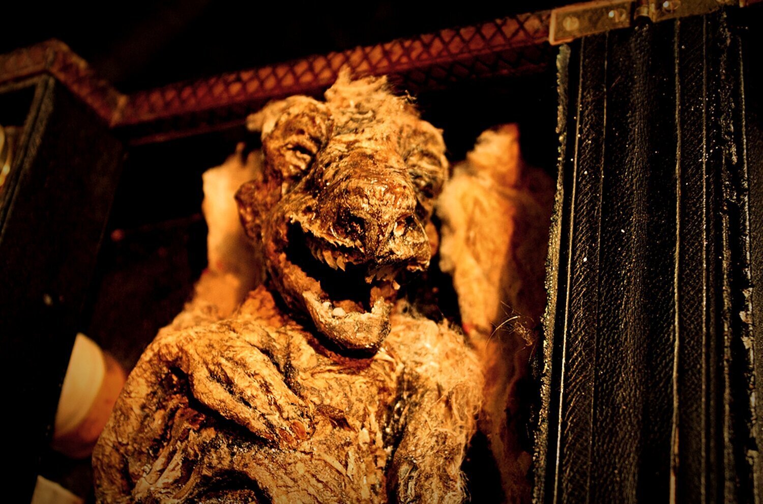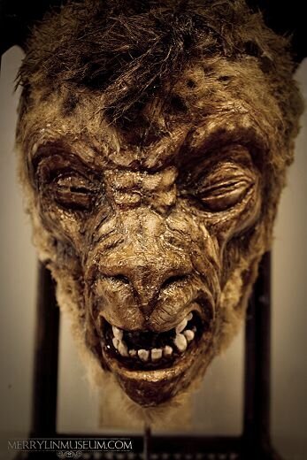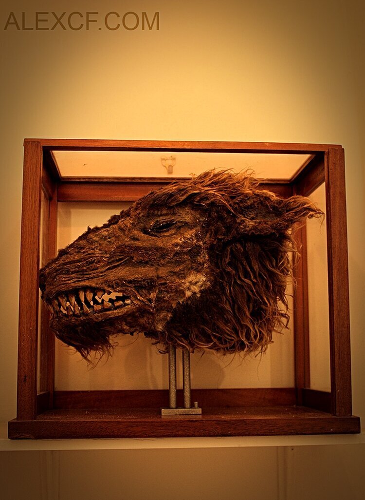 Этот экспонат(фото 1) представляет собой неполное превращение человека в оборотня, его поймали и обезглавили за кражу овцы. Обратите внимание на короткую морду и все еще сохранившиеся черты лица, похожие на человеческие.