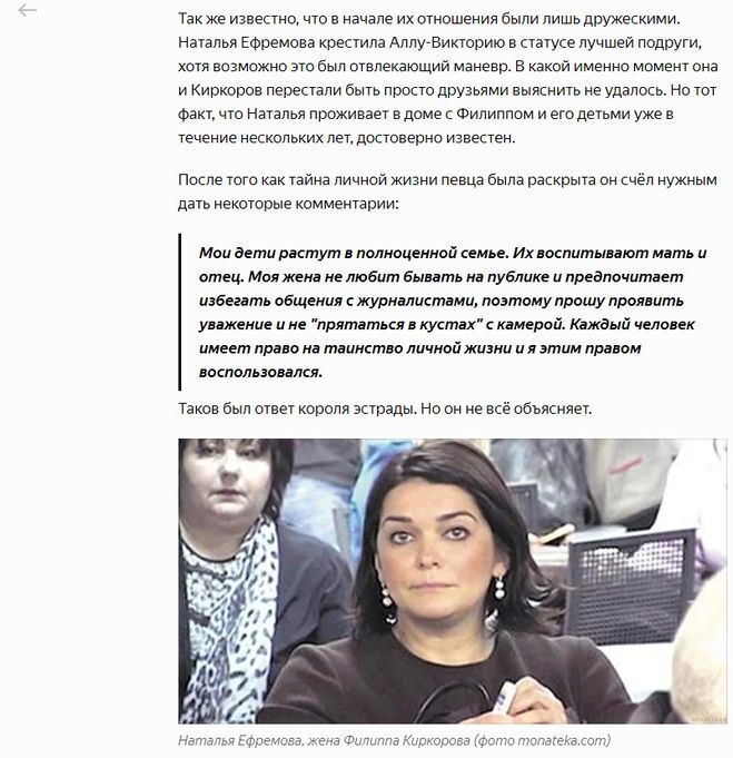 Достоверно известно, что уже несколько лет Наталья Ефремова живет в доме Кирокорова вместе с ним и детьми... Киркоров официально женат (тайно женился еще в 2016 году на женщине по имени Наталья Ефремова).