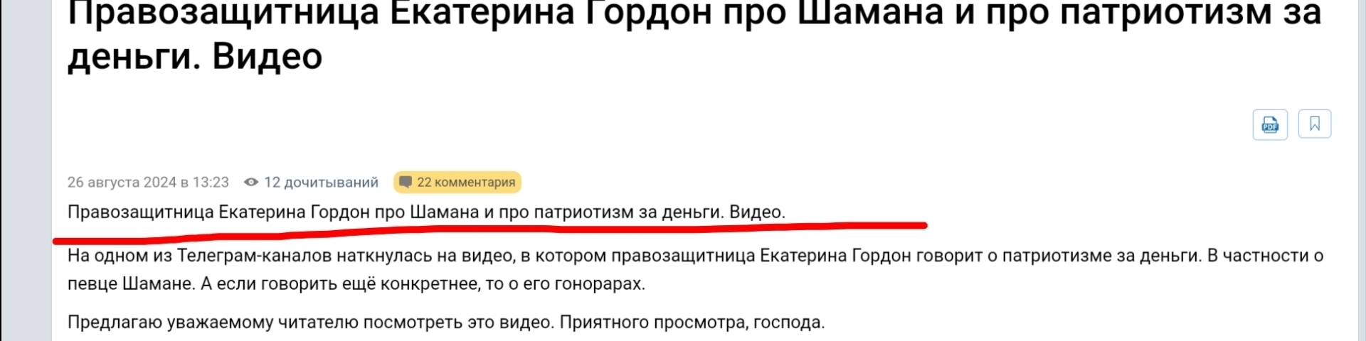 На одном из Телеграм-каналов наткнулась на видео, в котором правозащитница Екатерина Гордон говорит о патриотизме за деньги. В частности о певце Шамане. А если говорить ещё конкретнее, то о его гонорарах.