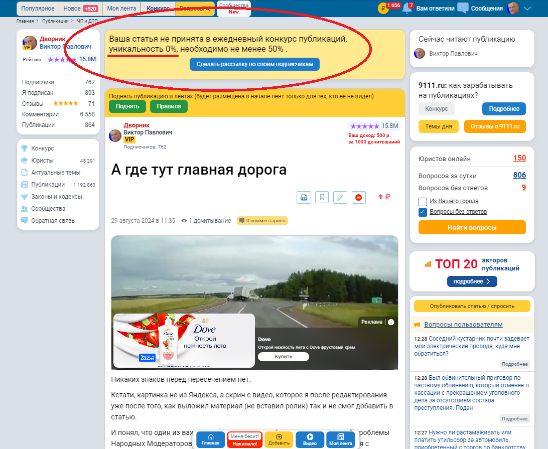Кстати, после размещения вышеупомянутой статьи о ДТП, увидел сообщение, что материалу присвоена уникальность 0. Я в легком шоке. Впрочем, как и многие после 28 августа.