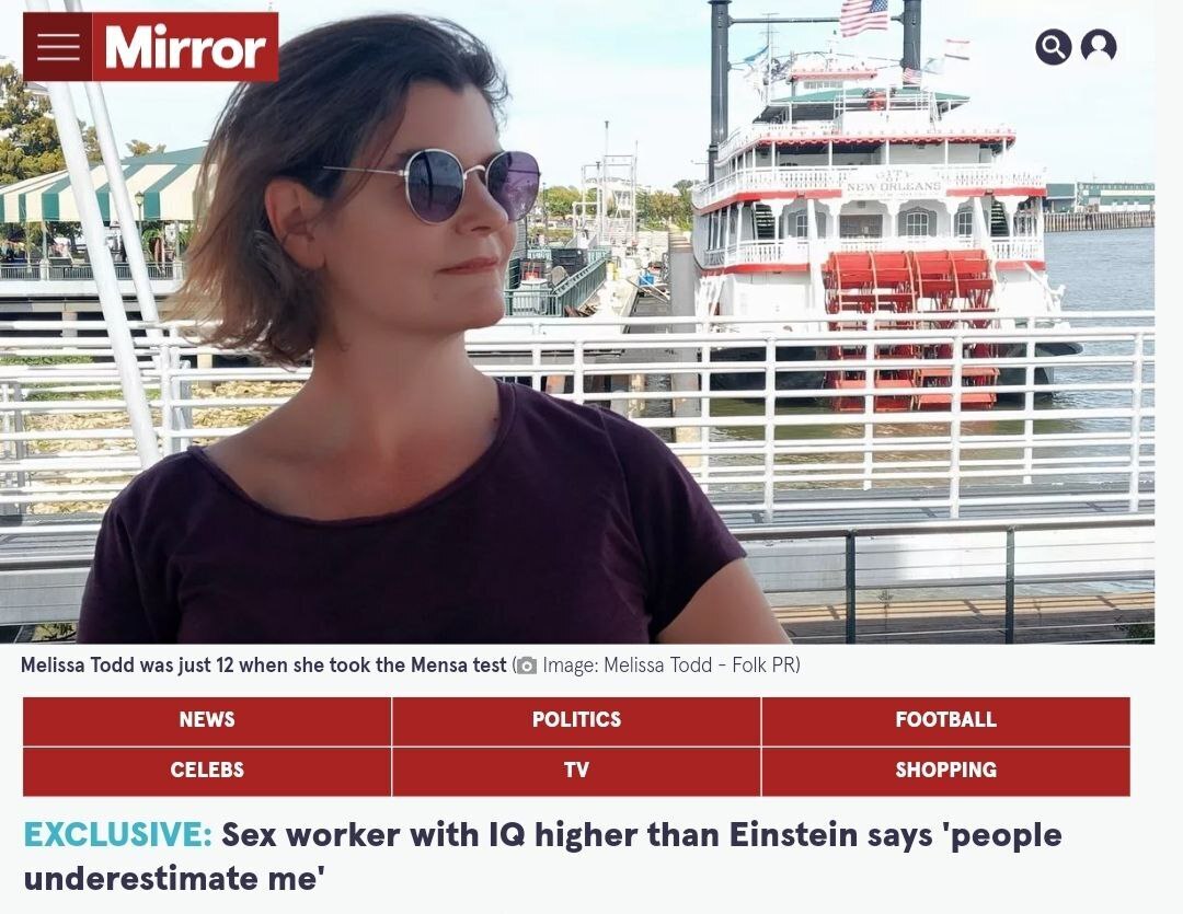 У Мелиссы Тодд IQ 178, это выше, чем у 98% населения планеты. Во время обучения она работала танцовщицей в стриптиз-баре и поняла, что в этой сфере можно заработать много денег и стать счастливой.