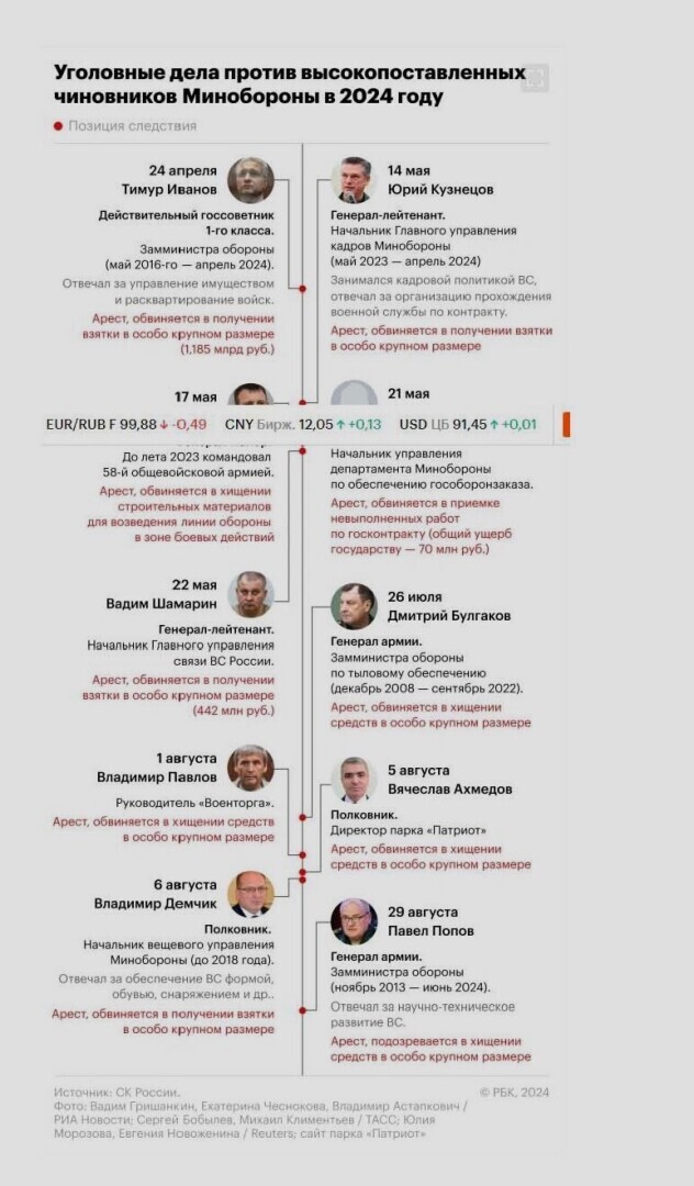 За последние полгода заведено несколько уголовных дел против высокопоставленных чиновников, которые ранее работали в Министерстве обороны. На сайте РБК представлена инфографика по указанным уголовным делам.